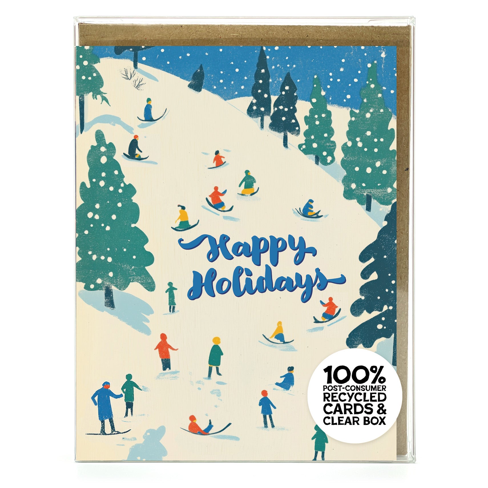 This Box Set contains 8 cards and 8 envelopes — packed neatly in a crystal clear, 100% post-consumer recycled plastic box. The cards, envelopes and box are all recyclable.