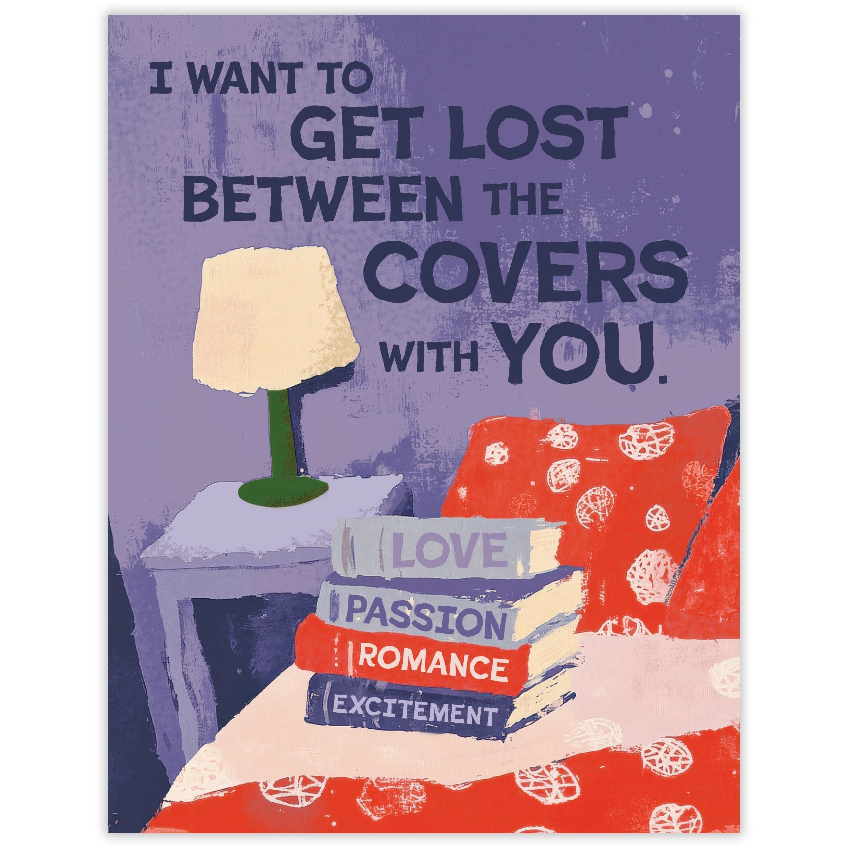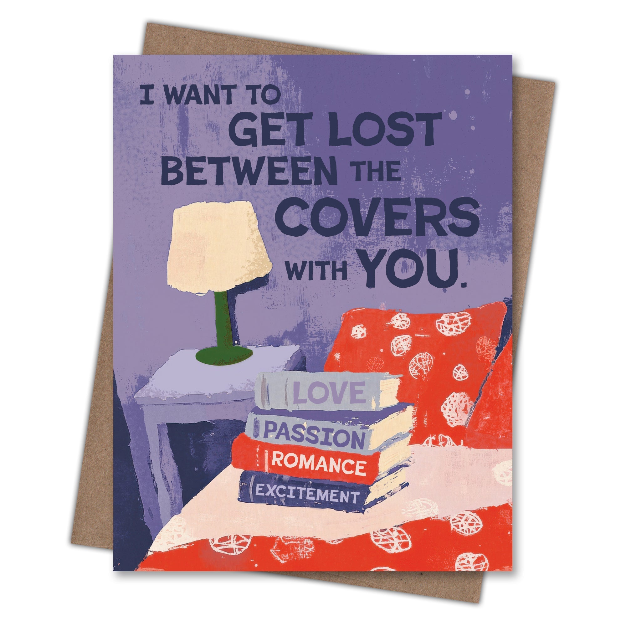 A cozy stack of books on a bed sets the scene for romance with the line 'I want to get lost between the covers with you.' Perfect for readers, writers, bookish types or anyone who loves a clever turn of phrase. Printed on 100% recycled paper because we love trees as much as we love helping you connect. Blank inside, so you can write whatever you want. Comes with a recycled kraft envelope so the whole thing is easy on the eyes and the earth. All Scarecrow & Nut Tree cards are sleeveless, but clear sleeves are available upon request. 4.25 in x 5.25 in.