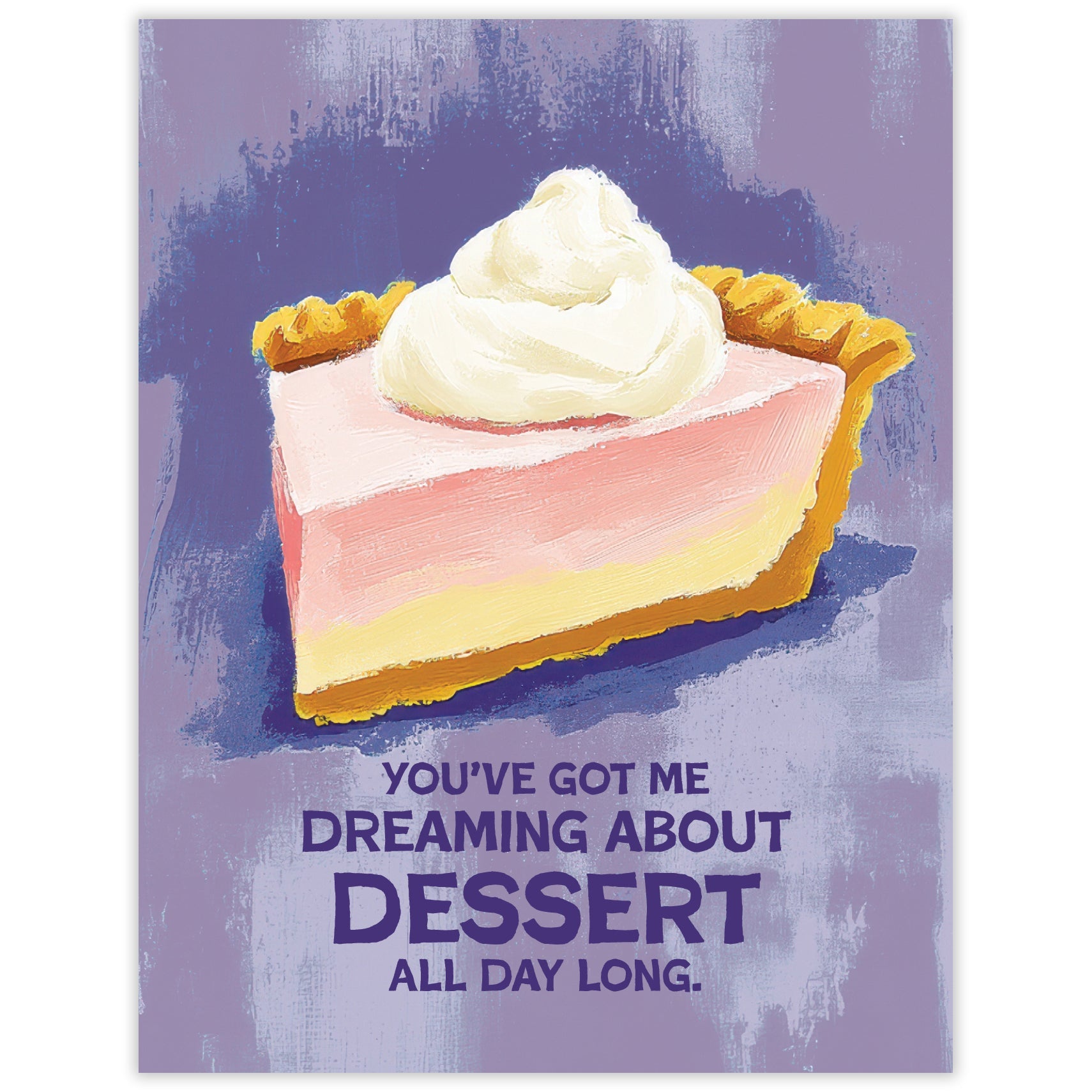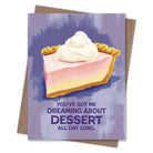 A pink cream pie sets the stage for the line 'You've got me dreaming about dessert all day long,' a deliciously dirty wink for that certain someone you canÕt get off your mind. Printed on 100% recycled paper because we love trees almost as much as we love a good double entendre. Greeting cards in the Hot Date collection are blank inside, which means you can write whatever you want. We're partial to sweet, sexy, or scorchingly scandalous. But you do you - or each other. Comes with a recycled kraft envelope so the whole package looks as good as you're about to make them feel. All Scarecrow & Nut Tree cards are sleeveless, but clear sleeves are available upon request. 4.25 in x 5.25 in.