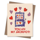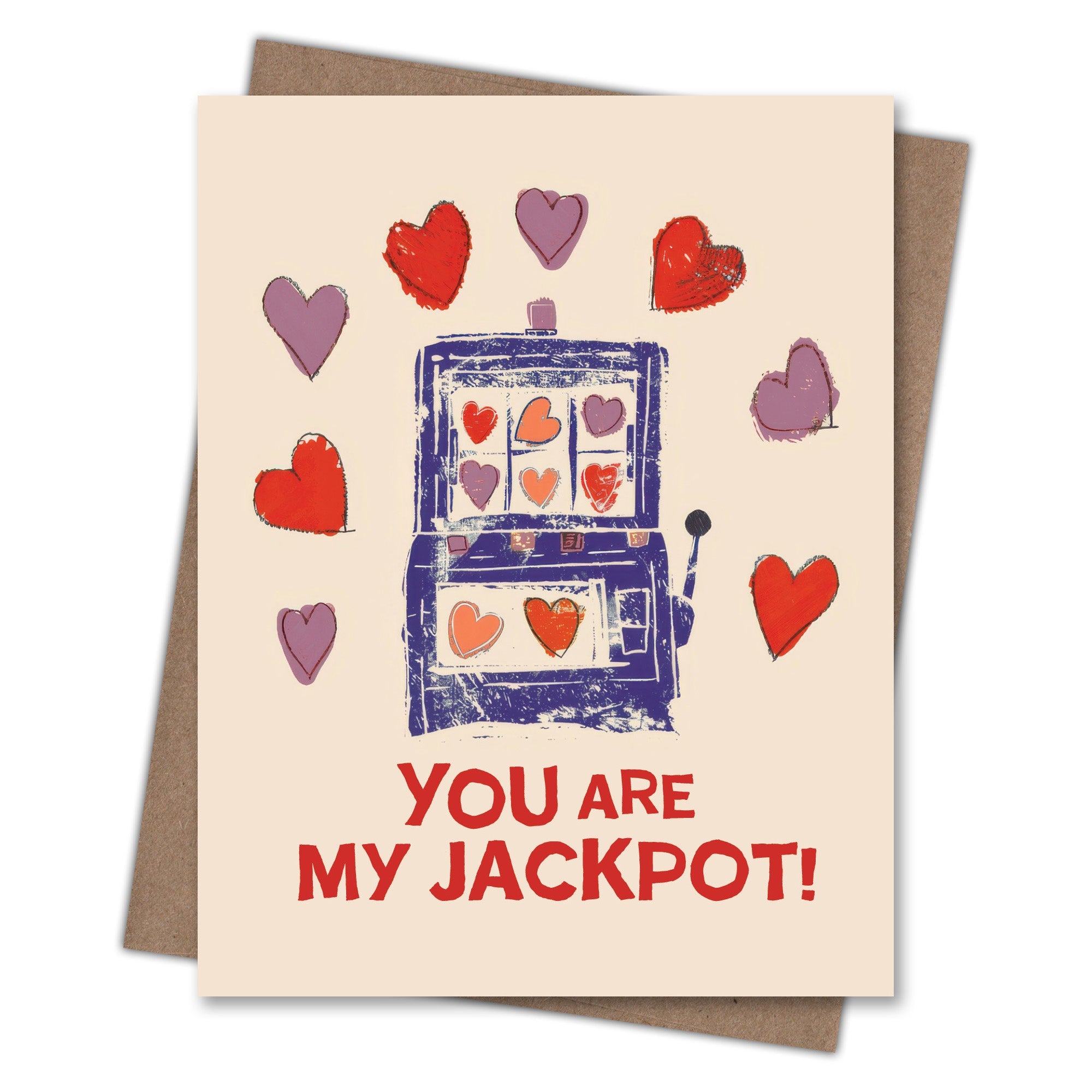 A slot machine filled with hearts pays out big love, making this a fun choice for anyone in love or celebrating a lucky romance. Printed on 100% recycled paper because we love trees as much as we love helping you connect. Blank inside, so you can write whatever you want. Comes with a recycled kraft envelope so the whole thing is easy on the eyes and the earth. All Scarecrow & Nut Tree cards are sleeveless, but clear sleeves are available upon request. 4.25 in x 5.25 in.