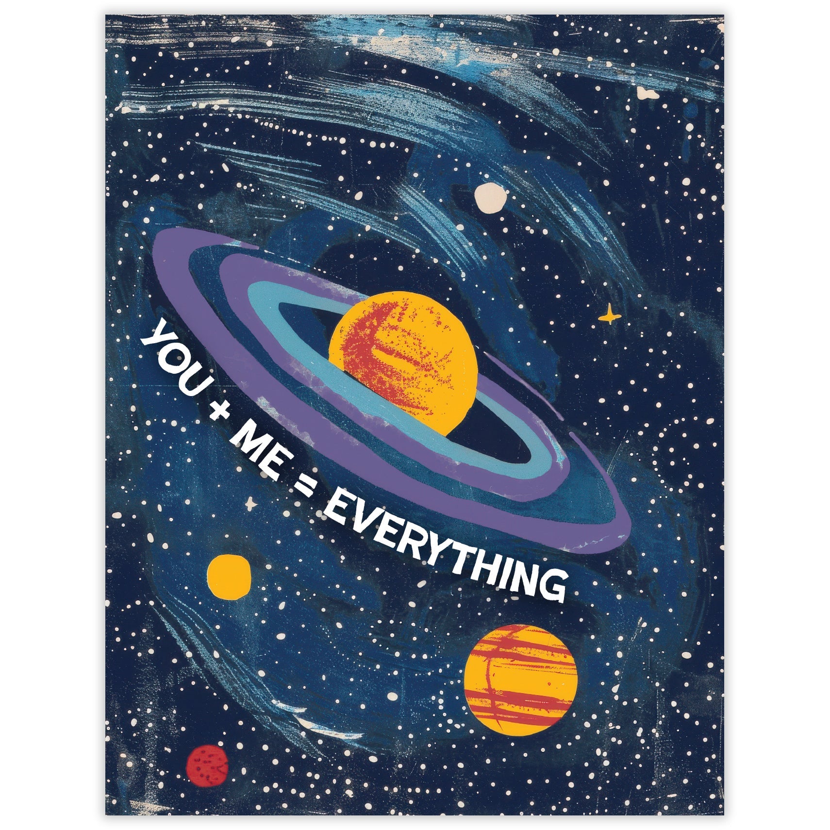 Stars and planets fill the sky around the playful equation 'you + me = everything,' perfect for stargazers, astronomy lovers, or anyone who means the universe to you. Printed on 100% recycled paper because we love trees as much as we love helping you connect. Blank inside, so you can write whatever you want. Comes with a recycled kraft envelope so the whole thing is easy on the eyes and the earth. All Scarecrow & Nut Tree cards are sleeveless, but clear sleeves are available upon request. 4.25 in x 5.25 in.