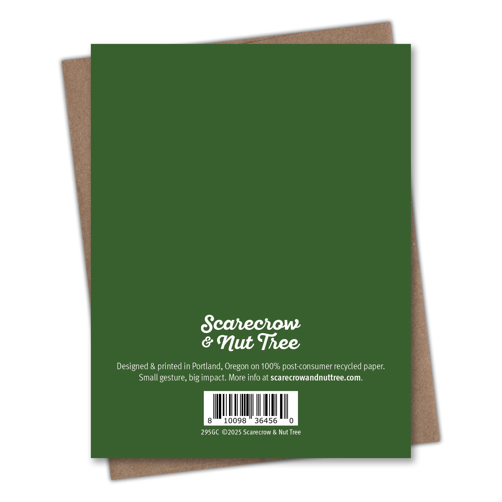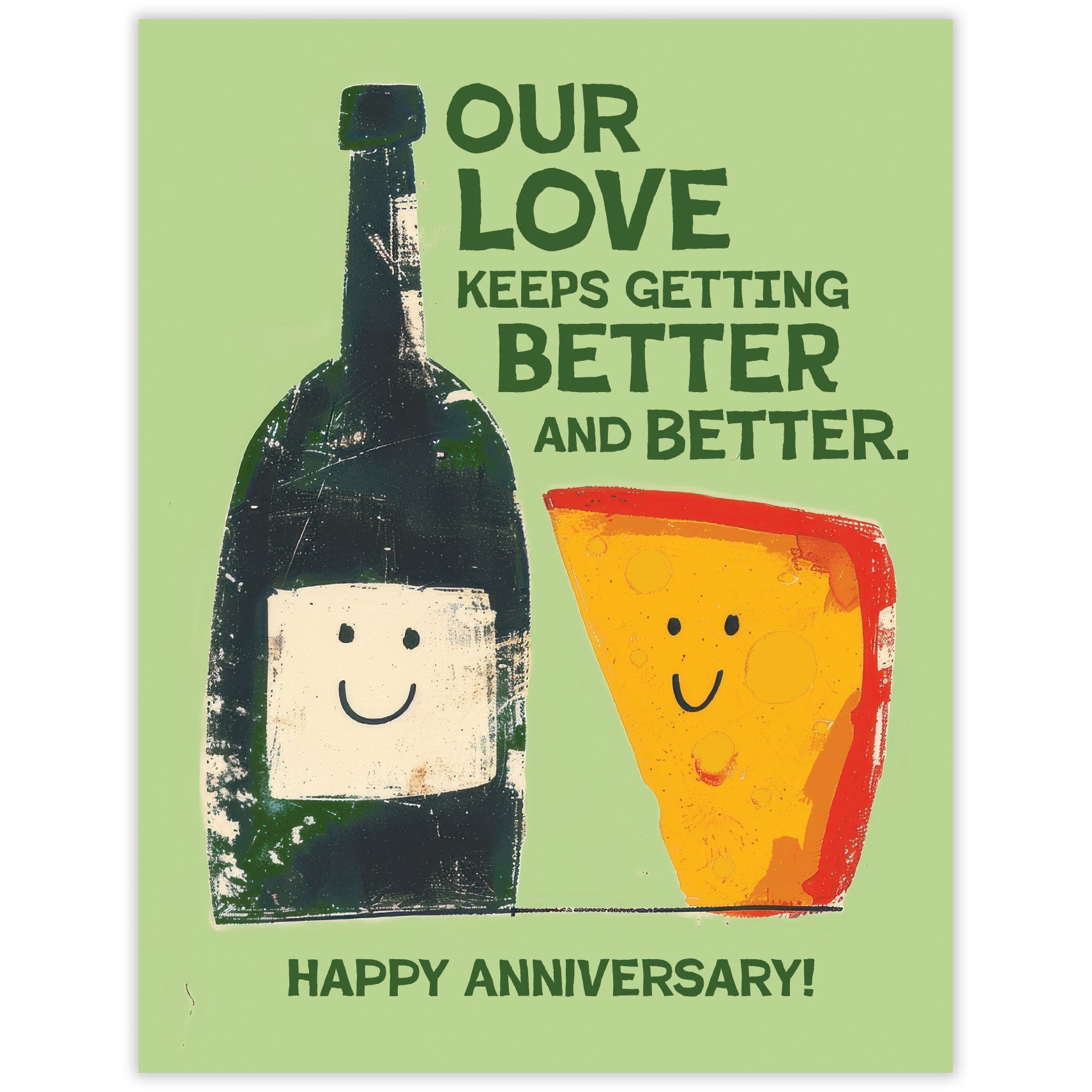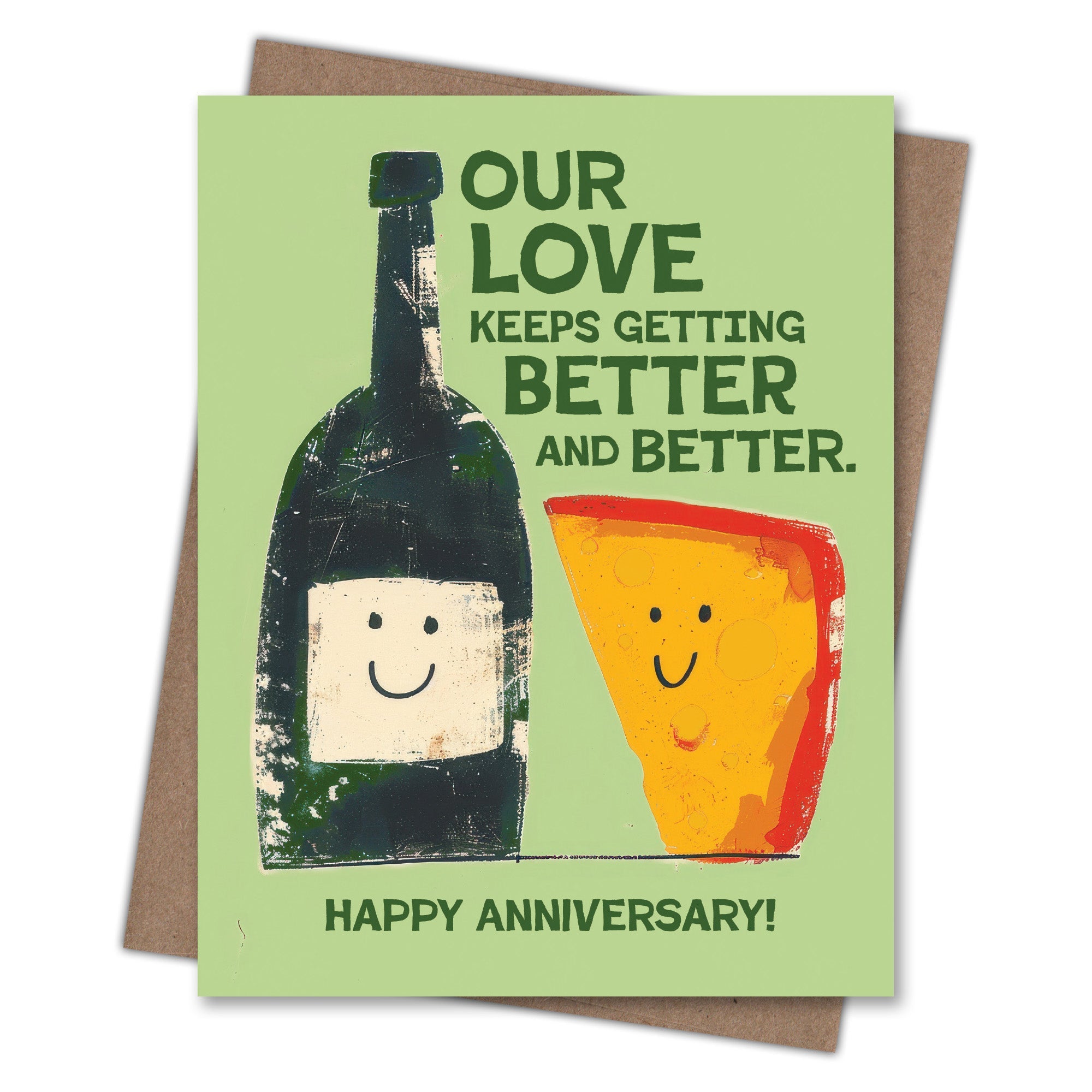 A smiling bottle of wine and wedge of cheese celebrate with the line 'Our love keeps getting better and better,' making this an ideal anniversary card for foodies or couples who age well together. Printed on 100% recycled paper because we love trees as much as we love helping you connect. Blank inside, so you can write whatever you want. Comes with a recycled kraft envelope so the whole thing is easy on the eyes and the earth. All Scarecrow & Nut Tree cards are sleeveless, but clear sleeves are available upon request. 4.25 in x 5.25 in.