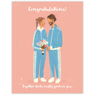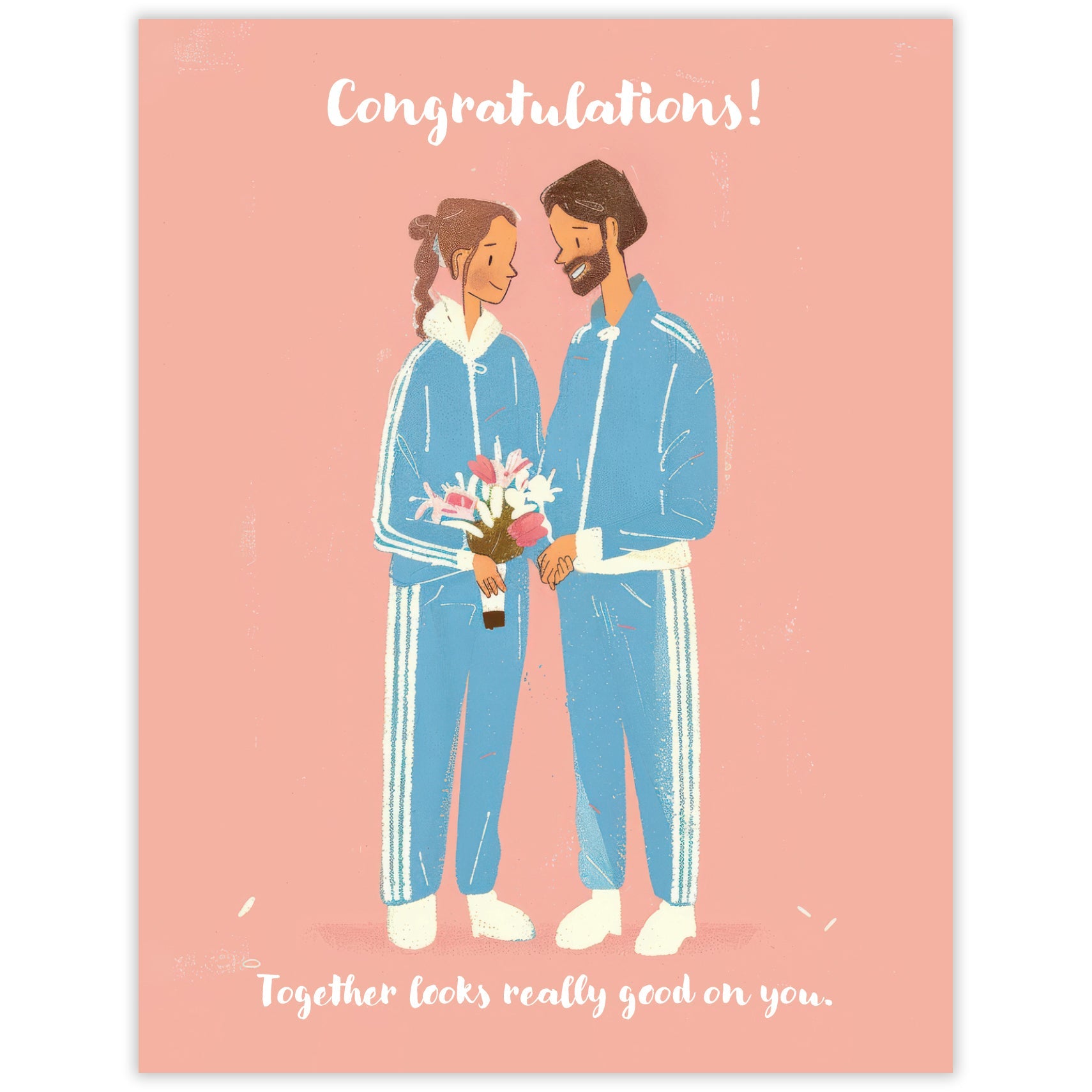 A couple in matching blue track suits share a loving gaze in this playful modern wedding card that celebrates how good they look together in every way. Printed on 100 percent recycled paper because we love trees as much as we love helping you connect. Blank inside so you can write whatever you want. Comes with a recycled kraft envelope so the whole thing is easy on the eyes and the earth. All Scarecrow and Nut Tree cards are sleeveless but clear sleeves are available upon request. 4.25 in x 5.25 in.