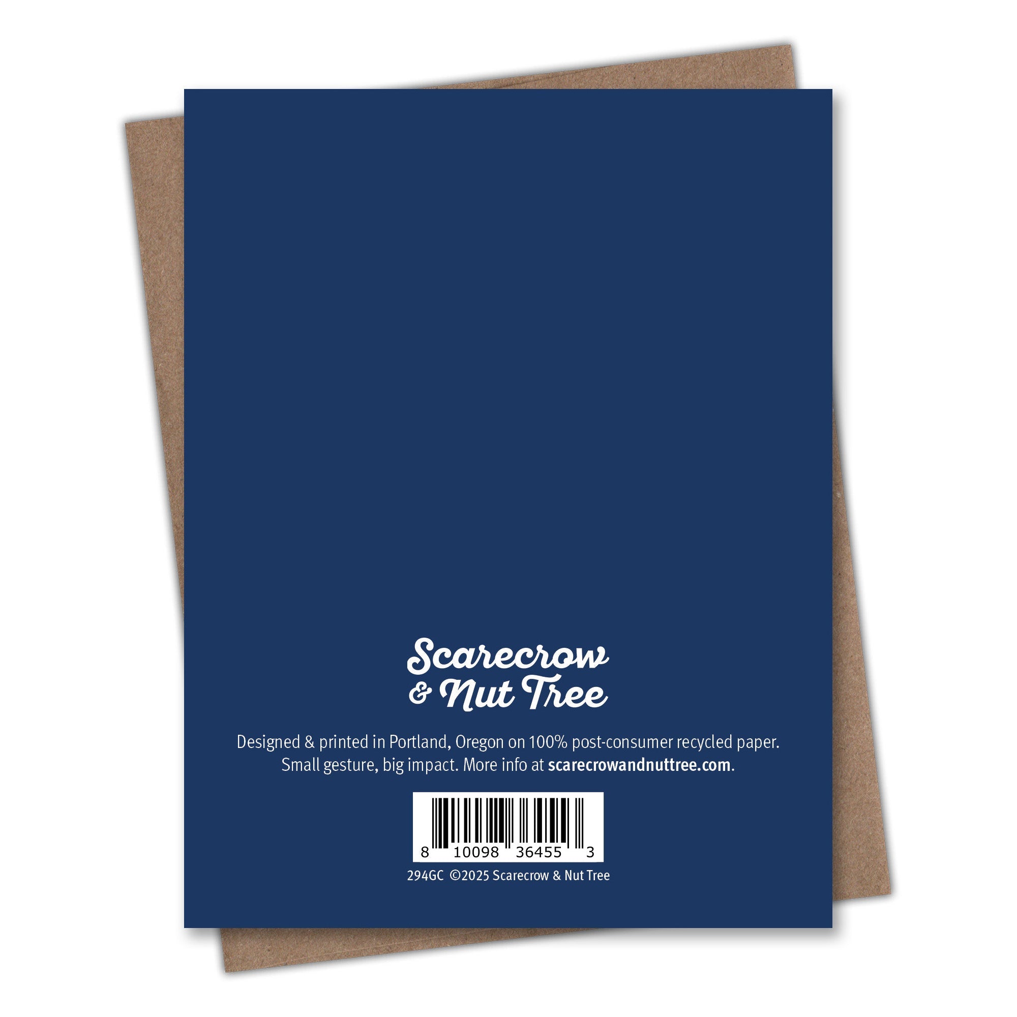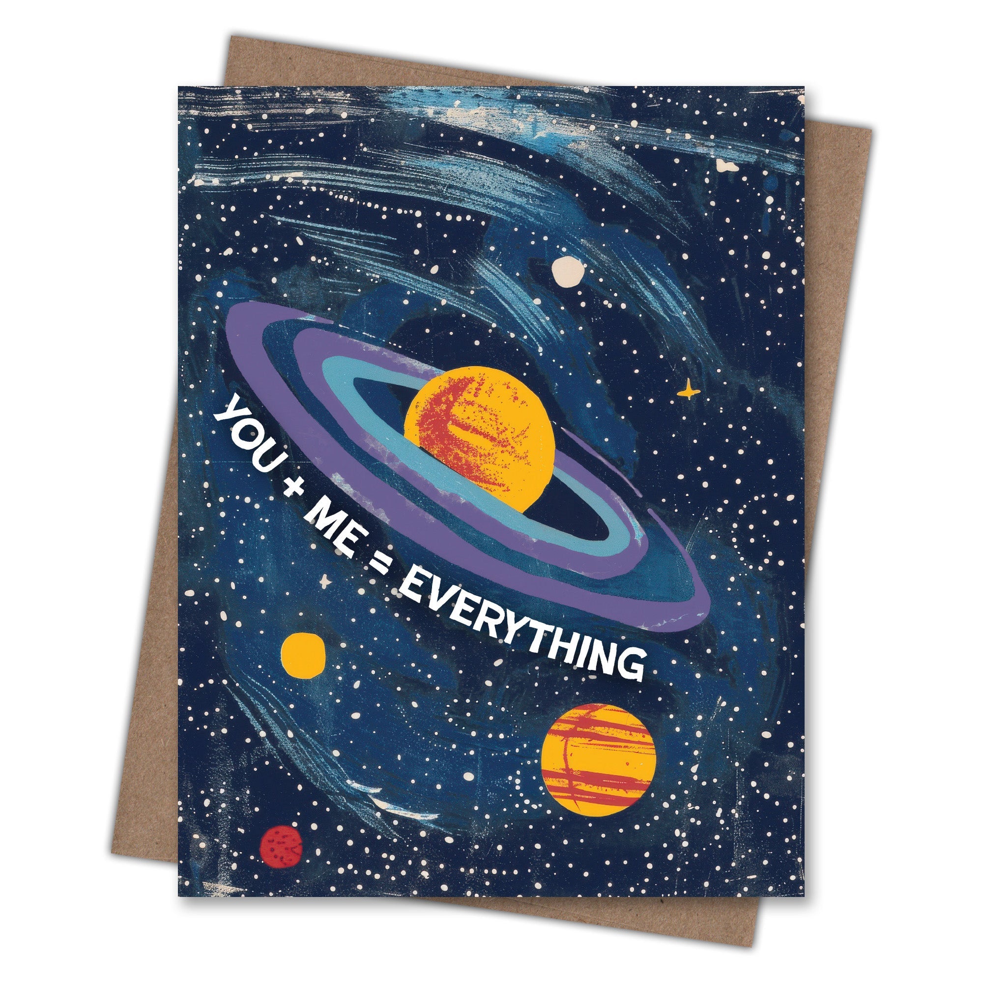 Stars and planets fill the sky around the playful equation 'you + me = everything,' perfect for stargazers, astronomy lovers, or anyone who means the universe to you. Printed on 100% recycled paper because we love trees as much as we love helping you connect. Blank inside, so you can write whatever you want. Comes with a recycled kraft envelope so the whole thing is easy on the eyes and the earth. All Scarecrow & Nut Tree cards are sleeveless, but clear sleeves are available upon request. 4.25 in x 5.25 in.